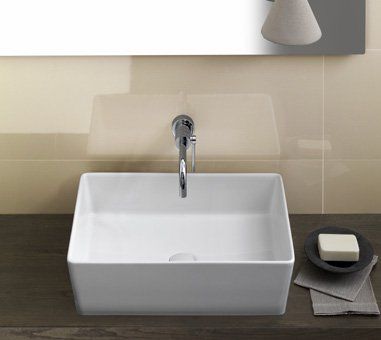 50x38 cm surface-mounted washbasin. Can be installed on Sliding wood system base unit. No overflow.
