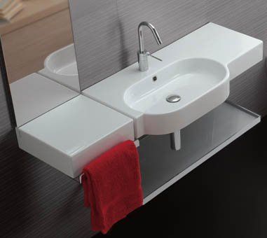 Washbasin with asymmetric left basin placeable in line, in the corner or as surface washbasin mounted on its own furniture or on A-wood. One hole (predisposed three holes). Combined with Area ceramic shelf and towel holder accessories.