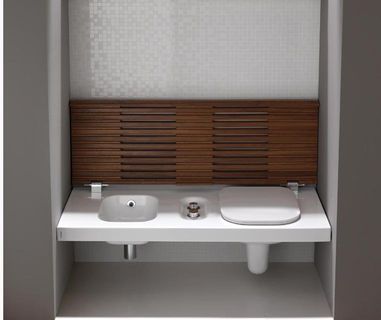 Multipurpose bench with integrated toilet and bidet, right-hand WC version. Bidet mixer, remote push-button, soft close thermosetting with quick release system seat cover, wood solid cover with clutch controlled opening and closing, included. Special reversible bracket (YXGZ) ,Geberit "Unica+" cistern (YXDW) and special short trap (Y0Q3) to be ordered separately.
