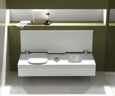 Multipurpose bench with integrated toilet and bidet without overflow, left-hand WC version. Bidet mixer, remote push-button, soft close thermosetting with quick release system seat cover, white composite material cover with clutch controlled opening and closing, included. Special reversible bracket (YXB7) ,Geberit "Unica+" cistern (YXDW) and special short trap (Y0Q3) to be ordered separately.