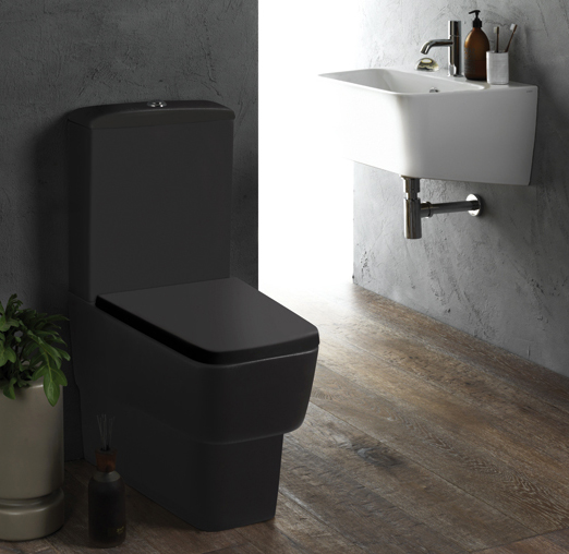Back to wall close coupled WC with wall or floor outlet (curved pipe included).