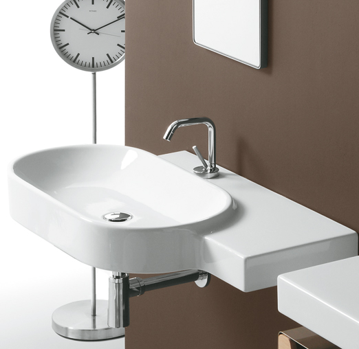 Oval wall hung washbasin 88 with right shelf pre-punched for single tap hole.