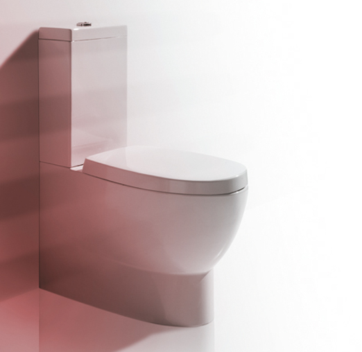 Back to wall close coupled WC Base with wall or floor outlet (Curved pipe included) and cistern with lid.